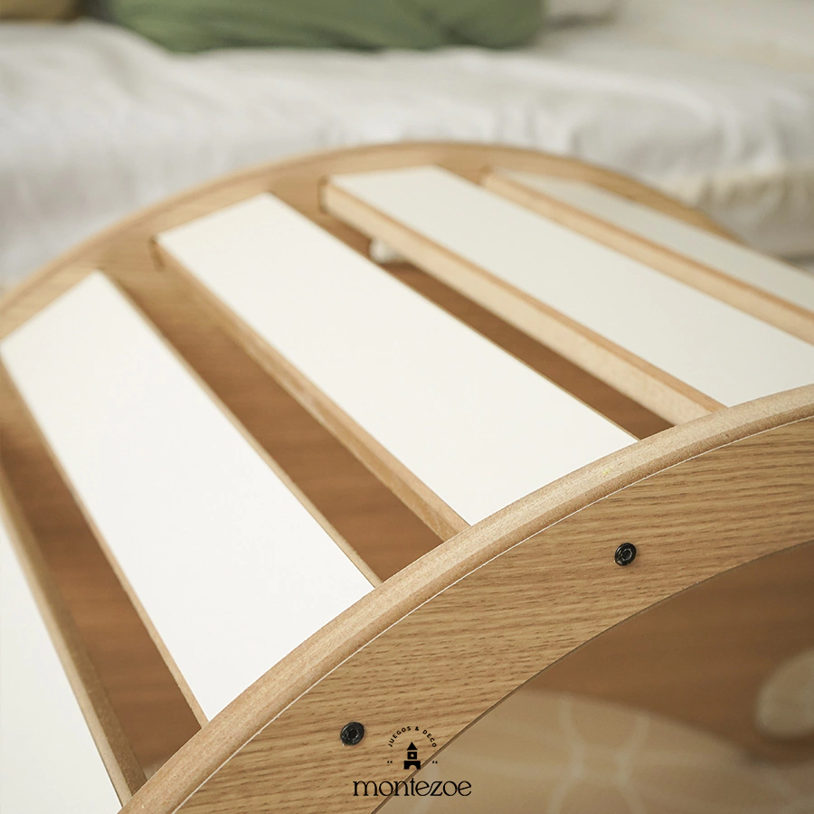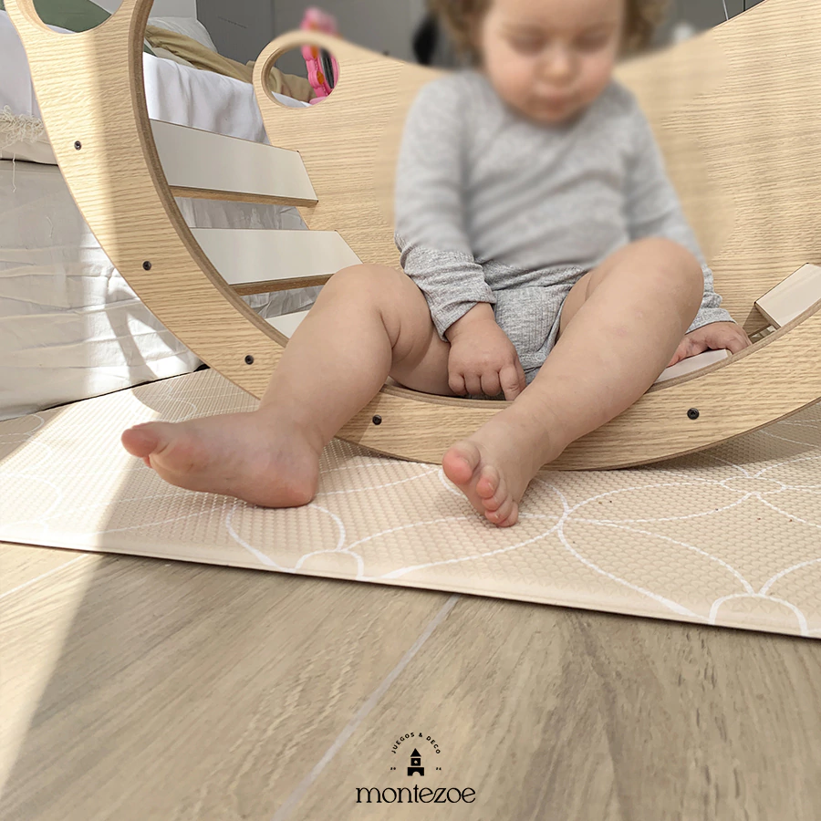 El balancín Mesa es un juguete educativo diseñado bajo los principios de la pedagogía Montessori y Pikler, que promueve el desarrollo autónomo y el aprendizaje a través del juego.
